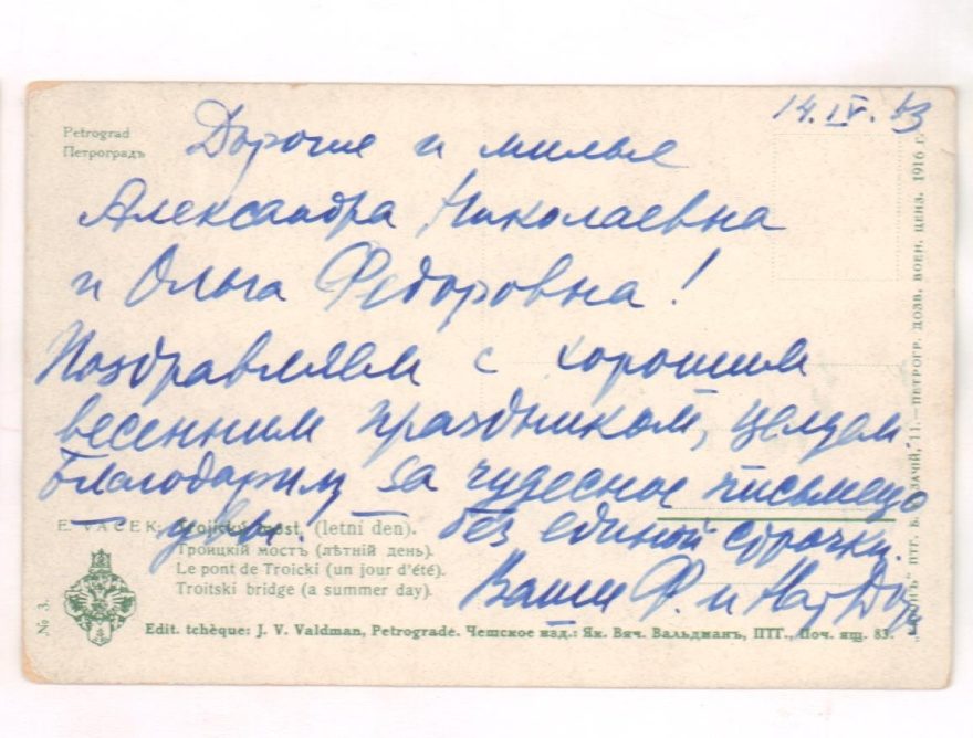 14.VI.19х3 Дорогие и милые Александра Николаевна и Ольга Федоровна! Поздравляем с хорошим весенним праздником, целуем. Благодарим за чудесное письмецо - увы - без единой строчки. Ваши Ф. и Нат {подпись}