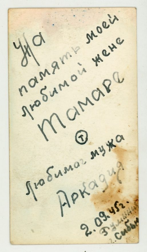 На память моей любимой жене Тамаре от Любимаг[^Любимого] мужа Аркадия. 2.09.45г. Румыния г. Сибью[^Сибиу].