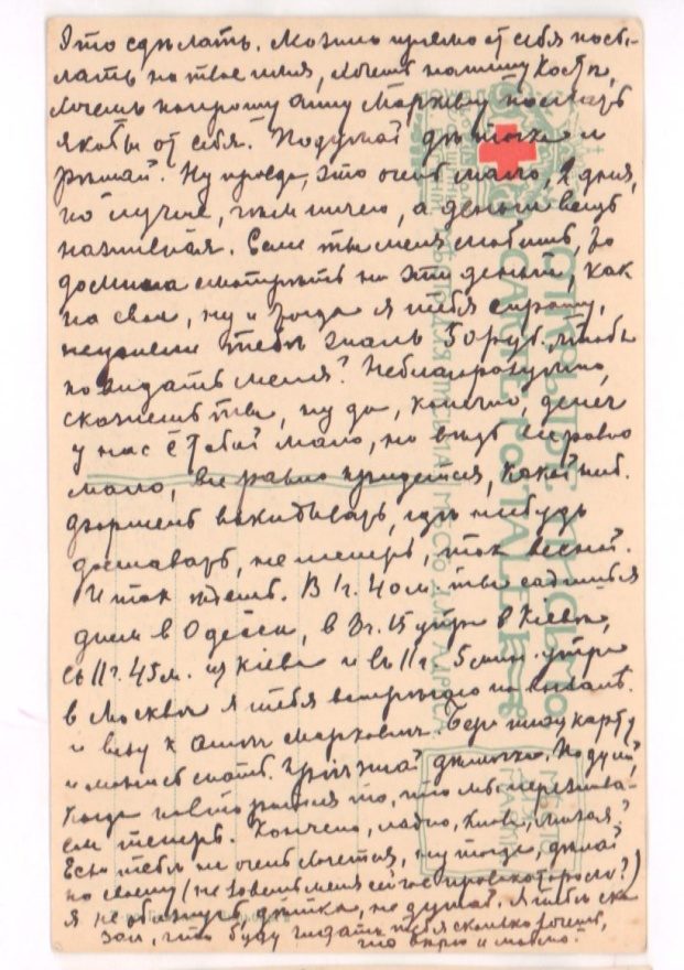 Это сделать. Можешь прямо от себя постлать [^послать] на твое имя, хочешь напишу Косте, хочешь попрошу Анну Марковну послать якобы от себя. Подумай деточка и решай. Ну просто, это очень мало, 2 дня, но лучше, чем ничего, а деньги вещь наживная. Если ты меня любишь, то должна смотреть на эти деньги, как на свои, ну и тогда я тебя спрошу, неужели тебе жаль 50 руб[лей], чтобы повидать меня? Неблагоразумно, скажешь ты, ну да, конечно, денег у нас с тобой мало, но ведь все равно мало, все равно придется, какой-ниб[удь] фортель выкидывать, где-нибудь доставать, не теперь, так весной. И так едешь. В 1 ч[ас] 40 м[инут] ты садишься днем в Одессе, в 3 ч[аса] 15 утра в Киеве, с 11 ч[асов] 45 м[инут] из Киева и с 11 ч[асов] 5 мин[ут] утра в Москве я тебя встречаю на вокзале. и везу к Анне Марковне. Бери плацкарту и ложись спать. Приезжай деточка. Подумай, когда повториться то, что мы переживаем теперь. Кончено, ладно, когда, милая? Если тебе не очень хочется, ну тогда, делай по своему [^по-своему] (не зовешь меня сейчас провокатором?) Я не обижусь, детка, не думай. Я тебе сказал, что буду ждать тебя сколько хочешь, что верю и люблю.