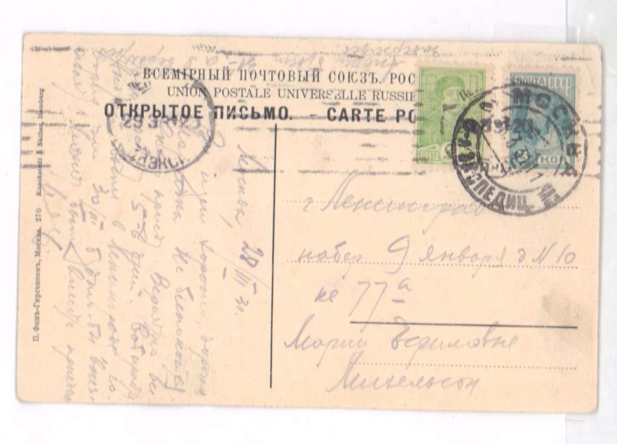 Москва, 28/III 31. Все идет хорошо, дорогая Мариша. Не беспокойся. [?Скоро] приеду. Вероятно все [нрзб] 5-6 дней. Вот [нрзб] Андрей быть в Ленинграде, говорил что 30/III будто-бы [^будто бы] выезжает. Может быть [?вместе] [приста...] {Андрей будет 31-го, а я вероятно задержусь.)