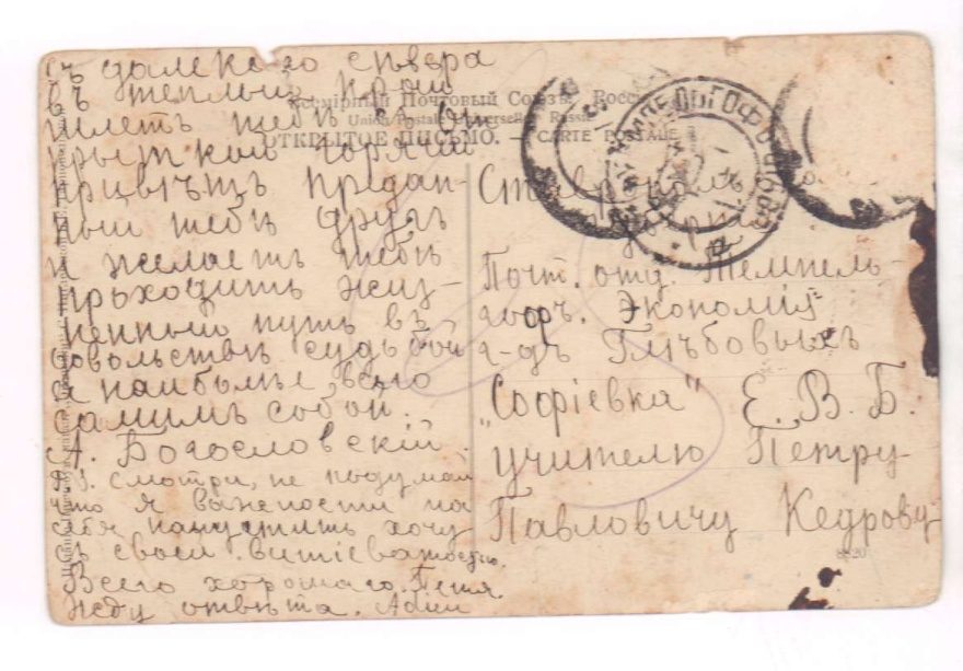 С далекого севера в теплый край шлет тебе с открыткой горячий привет преданный тебе друг и желает тебе проходить жизненный путь в довольстве судьбой и наиболее всего самим собой. А. Богословский. P.S. смотри, не подумай что я важности на себя напустить хочу со своей витиеватостью. Всего хорошего. Петя. Жду ответа. Adieu.