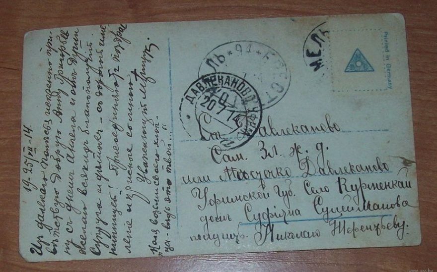 Куда: Ст. Давлеканово Сам[аро]-Зл[атоустовская] ж[елезная] д[орога] или Местечко Давлеканово Уфимской губ. Село [?Курсненкай] дом Суфияна Сулейманова