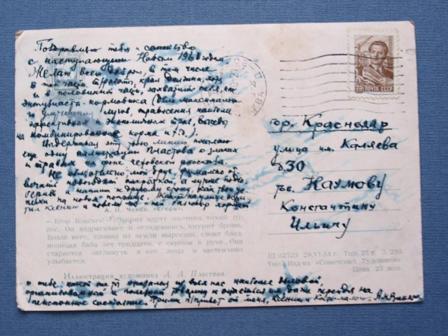 Поздравляю тебя и семейство с наступающим Новым 1961 годом. Желаю всего доброго, в том числе в той части страны, края должка, моря и в половинный ча[нрзб] лахварила тебя, как энтузиаста - кормовика(дело максимального улучшения лугов, травосения ка[нрзб] эффективных и экономичных трав, высевы на комбинированные корма и т.д.) [нрзб] эту твою линию, посылаю ещё одну иллюстрацию Пластова о злаках и травах на фоне Чеховского рассказа. Не обязательно, мой друг, фум[нрзб] отвечать открыткой, а лучше подсобери-ка и напиши к другому сроку, как твои делихи на новом поприще.Как-то на улице встретил Ксению и провели мы с ней разговор хороший.