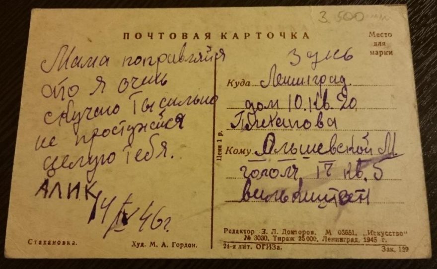 Мама поправляйся ато [^а то] я очень скучаю Ты сильно не простужайся целую тебя. Алик 14/IV 46 г.