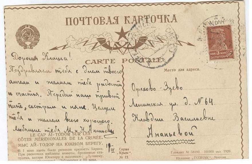 Описание открытки: Серия «Крым». 12. Главлит 58192. 10.000 экз. 1926. Издание «ГОЗНАК», Москва.