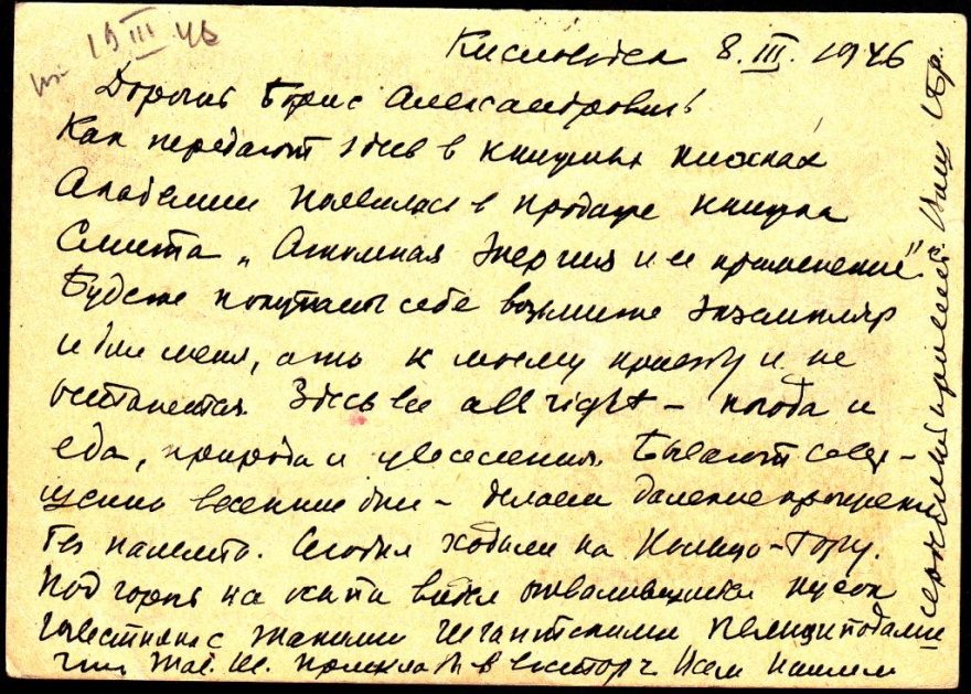 [?Кингисеп] 8.3.1946. Дорогой Борис Александрович! Как передают мне в книжных киосках Академии появилась в продаже книжка Смита "Атомная энергия и ее применение". Будете покупать себе возьмите экземпляр и для меня, а то к моему приезду и не останется. Здесь все all right - погода и еда, природа и увеселения. Бывают совершенно весенние дни - делаем далекие прогулки [нрзб] Сегодня ходили на [нрзб] - гору. Под горой на [нрзб] видел отвалившийся кусок известняка с такими гигантскими пелициподами , что [?Таи. Ш.] пришла в восторг. Всем нашим сердечный привет. Ваш Сбр.