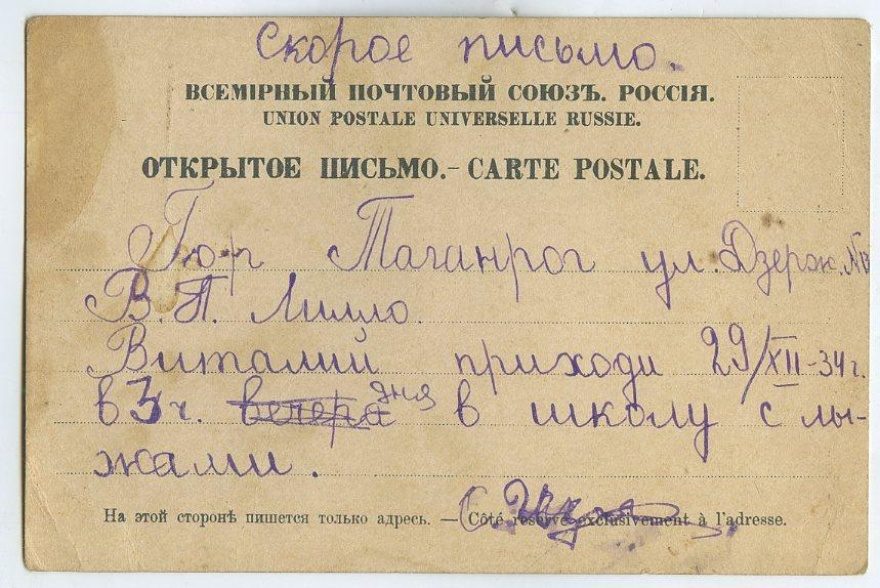{Скорое письмо.} Виталий приходи 29/XII-34 г. в 3 ч. вечера дня в школу с лыжами.