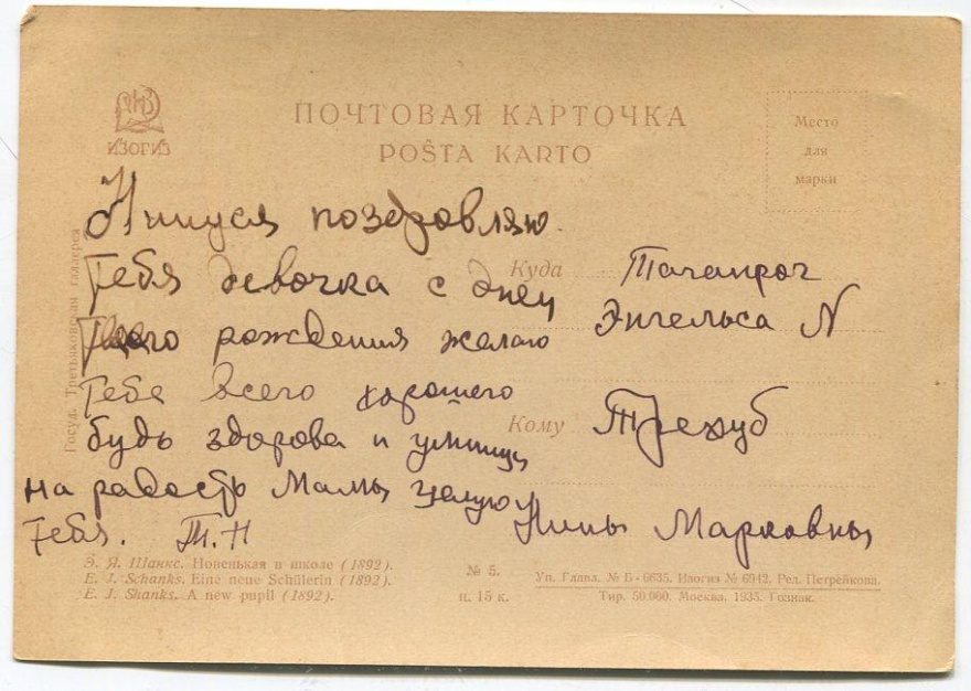Описание открытки: 15 к. Уп. Глава. № Б-6635. Изогиз № 6942. Ред. Петрейкова. Тир. 50.000. Москва. 1935. Гознак.