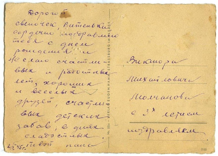 Дорогой сыночек, Витенька, сердечно поздравляю тебя с днем рождения и желаю счастливых и радостных лет, хороших и веселых друзей, счастливых детских забав, в днях сладостных. Твой папа. {С 3х летием поздравляю.} {2/X 45 г.}