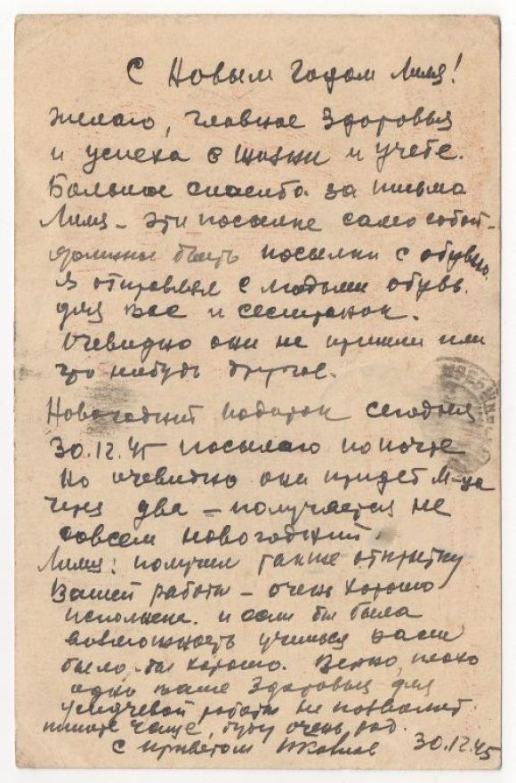 С Новым годом Лиля! Желаю, главное здоровья и успеха в жизни и учёбе. Большое спасибо за письмо. Лиля - эти посылки само собой должны быть посылки с обувью. Я отправлял с людьми обувь для вас и сестренок. Очевидно они не пришли или что-нибудь другое. Новогодний подарок сегодня 30.12.45 отправляю по почте, но очевидно он придёт м[еся]ца через два - получается не совсем новогодний. Лиля, получил так же открытку Вашей работы - очень хорошо исполнена и если бы была возможность учиться дальше - было бы хорошо. Верно, плохо одно ваше здоровье для сидячей работы не позволит. Пишите чаще, буду очень рад. С приветом [Ико...е] 30.12.45