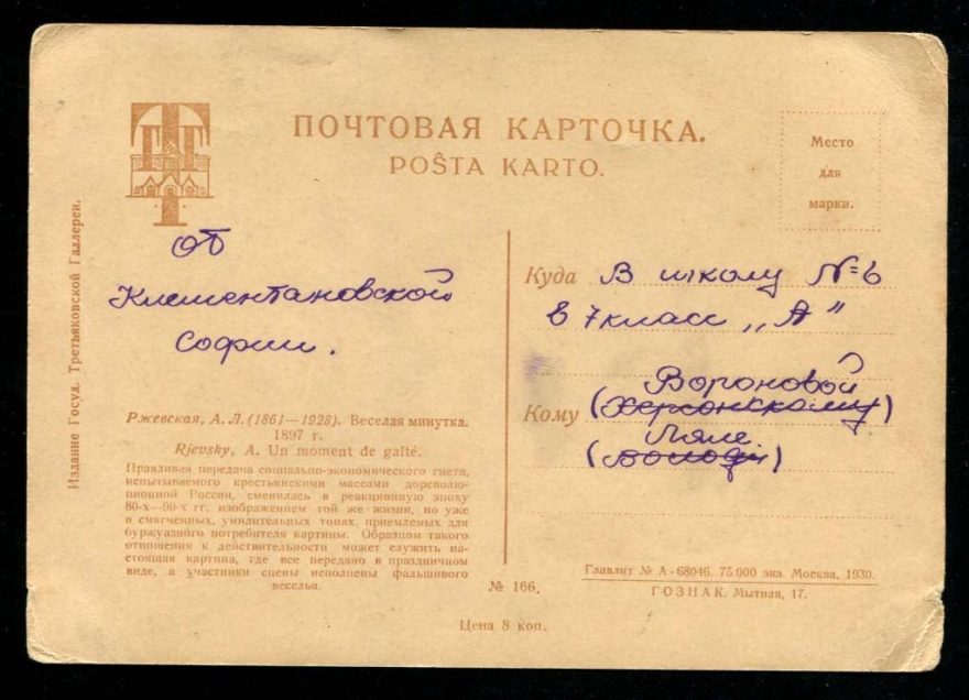 Описание открытки: Издание Государственной Третьяковской Галереи. Главлит № А-68046, 75000 экз. Москва. 1930. ГОЗНАК. Мытная, 17