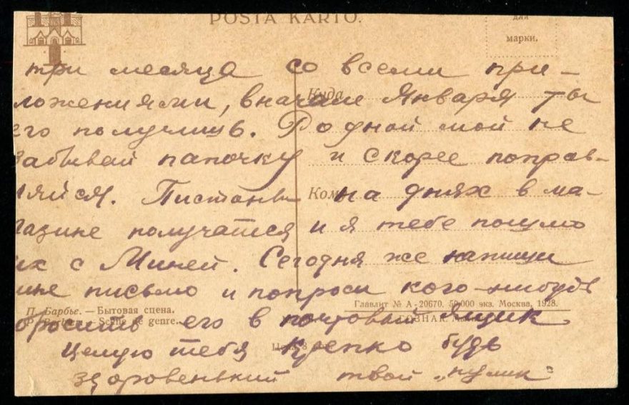 Три месяца со всеми приложениями, вначале [^в начале] января ты его получишь. Родной мой не забывай папочку и скорее поправляйся. Пистоны на днях в магазине получатся и я тебе пошлю их с Миней. Сегодня же напиши мне письмо и попроси кого-нибудь бросить его в почтовый ящик. Целую тебя крепко будь здоровенький твой «пулик»