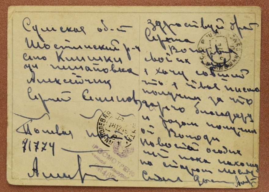 Здравствуй брат Сережа. Вопервых [^во-первых] свойих [^своих] слов я хочу собщит [^сообщить] что я твое письмо получил за что горячо благодару [^благодарю] и разом получил от Володи. Новостей сегодня нет, пока нахожу [^нахожусь] на старом месте. Сегодня [?дым]