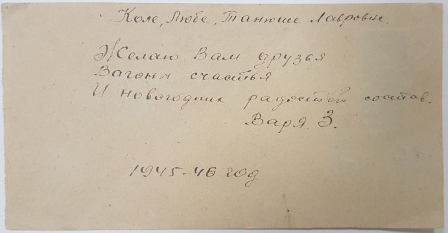 Коле, Любе, Танюше Лавровне. Желаю Вам друзья Вагоны счастья И новогодних радостей состав. Варя З. 1945-1946 год