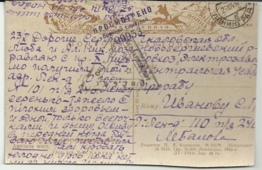 23/X. Дорогие Сергей, Люба и Ал. Ник[олаевич]. Поздравляю с пр[аздником] X. Письмо получила мой адр[ес] Лен[ингра]д 110, госп[...] №101 п/я 246. Живу серенько-тяжело с [...оним] здоровьем - и одной, только весточками и дышу. Живу в передней когда бываю дома, поставила там кровать. Холодно, дров пока нет [нрзб] {Вчера получила письмо от Вити он на новом [нрзб]}