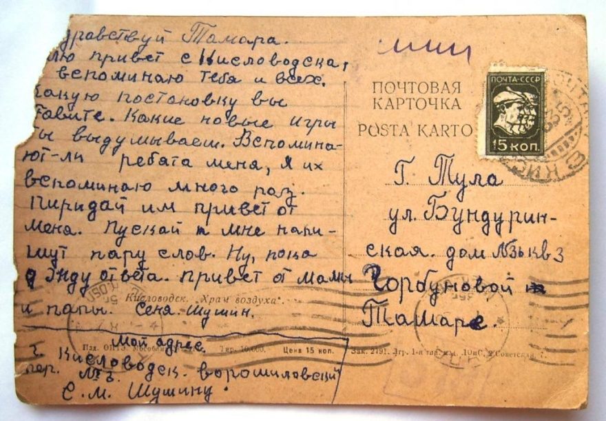 Здравствуй Тамара. Шлю привет с Кисловодска, вспоминаю тебя и всех. Какую постановку вы ставите. Какие новые игры ты выдумываеш [^выдумываешь]. Вспоминают-ли [^Вспоминают ли] ребята меня, я их вспоминаю много раз. Пиридай [^Передай] им привет от меня. Пускай и мне напишут пару слов. Ну, пока я жду ответа. Привет от мамы и папы. Сеня Шушин. Мой адрес. г. Кисловодск. ворошиловский. С. М. Шушину.