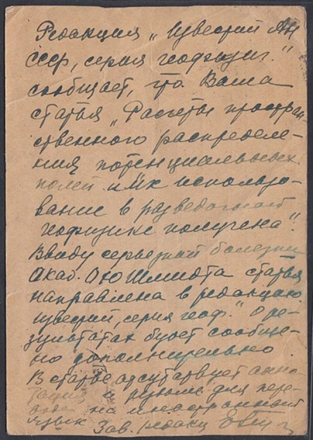 Редакция "Известий АН СССР, серия геофизич." сообщает, что Ваша старая "Расчеты пространственного распределения потенциальных полей и их использование в разведочной геофизике получена!! Ввиду серьезной болезни акад. О.Ю. Шмидта статья направлена в редакцию Известий, серия геоф. О результатах будет сообщено дополнительно. В статье отсутствует аннотация и [нрзб] для перевода на иностранный язык. Зав[едующий]. редакц[ии]. Евт.