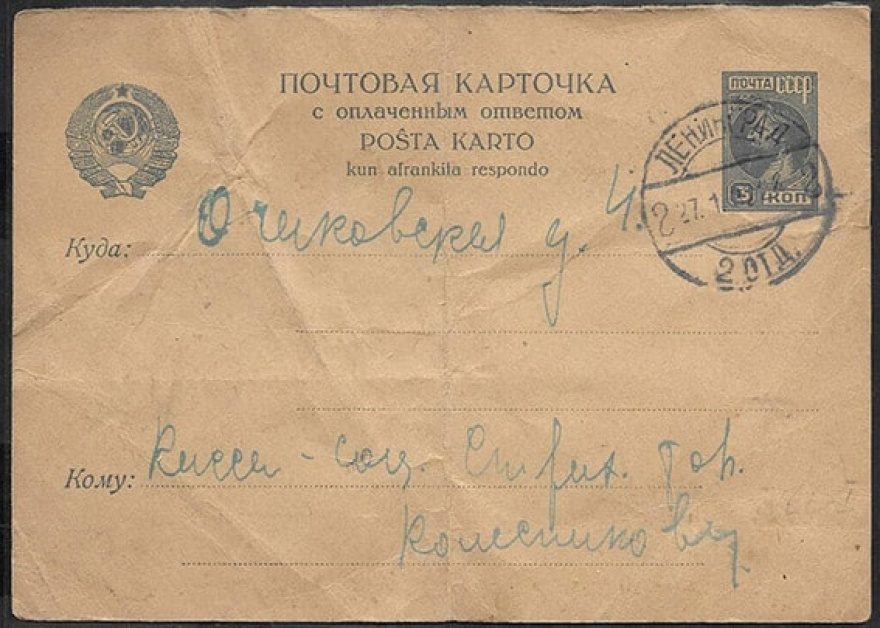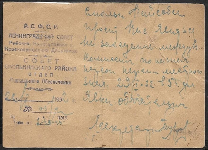 Смольн[инский] Райсобес просит Вас явиться на заседание междун[ародной] комиссии по назнач[ению] персон[ального] имения местного знач[ения] 29/I - 32. в 5 ч[асов] дня. Явки обязательны. Секретарь {подпись}