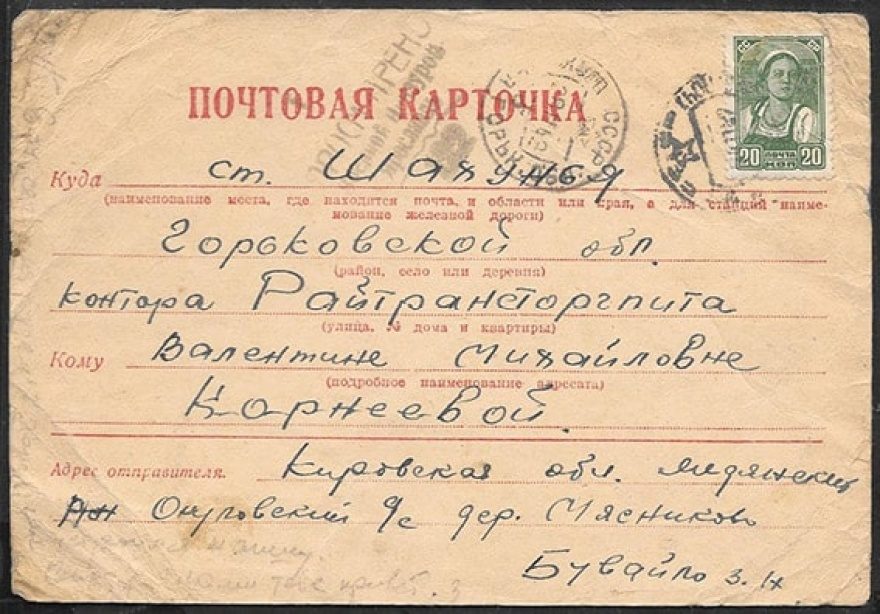 Куда: ст. Шахунья, Горьковской обл., контора Райтрансторгпита