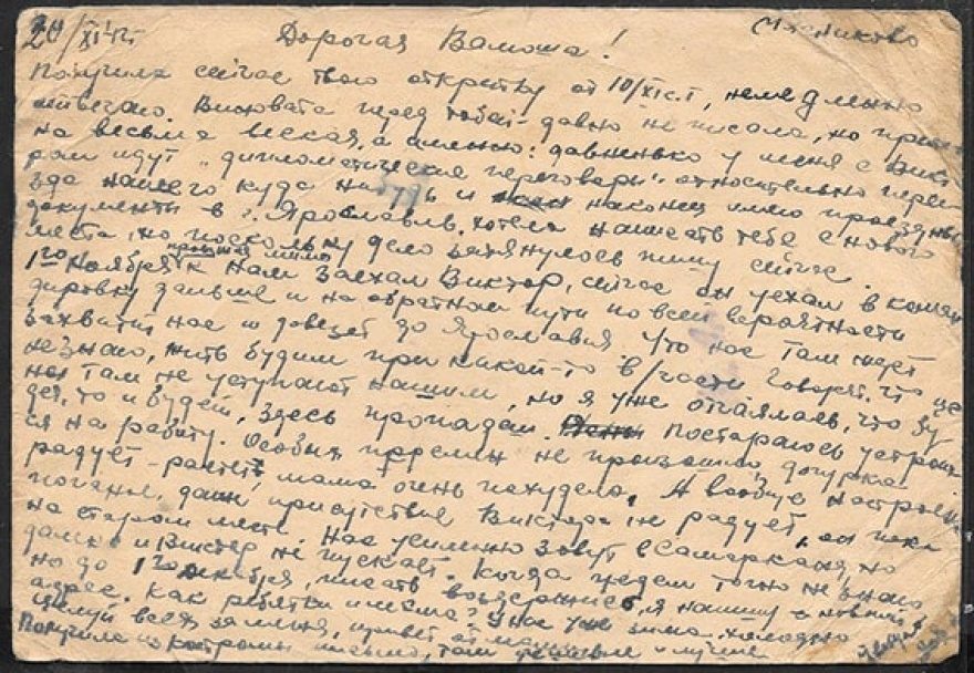 20/XI 42 Мясниково. Дорогая Валюша! Получила сейчас твою открытку от 10/XI с.г., немедленно отвечаю. Виновата перед тобой - давно не писала, но причина весьма веская, а именно: давненько у меня с Виктором идут "дипломатические переговоры" относительно переезда нашего куда нибудь [^куда-нибудь] и наконец имею проездные документы в г. Ярославль. Хотела написать тебе с нового места, но поскольку дело затянулось пишу сейчас. 1го ноября {проезжая мимо} к нам заехал Виктор, сейчас он уехал в командировку дальше и на обратном пути по всей вероятности захватит нас и довезет до Ярославля. Что нас там ждет не знаю, жить будим [^будем] при какой-то в/части. Говорят, что цены там не уступают нашим, но я уже отчаялась, что будет, то и будет, здесь пропадем. Постараюсь устроиться на работу. Особых перемен не произошло, дочурка радует - растет, мама очень похудела. А вообще настроен[ие] [?поганое], даже присутствие Виктора не радует, он пока на старом месте. Нас усиленно зовут в Самарканд, но далеко и Виктор не пускает. Когда уедем, точно не знаю, но до 1го декабря писать воздержись, я напишу с нового адреса. Как ребятки и мама? У нас уже зима, холодно. Целуй всех за меня, привет от мамы. Получила из Костромы письмо, там дешевле и лучше. Целую