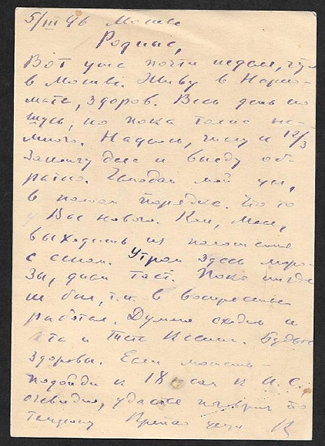 {5/III 46, Москва} Родные, Вот уже почти неделя, что я в Москве. Живу в Наркомате, здоров. Весь день ношусь, но пока толка немного [^не много]. Надеюсь, числу к 12/3 закончу дела и выеду обратно. Чемодан мой цел, в полном порядке. Что то у Вас нового? Как, Мася, выходишь из положения с сеном? Утром здесь морозы, днем тает. Пока нигде не был, т.к. в воскресенье работал. Думаю сходить к [?Кате] и Тете Ксении. Будьте здоровы. Если можешь – подойди к 18 сам к И. С., очевидно, удастся поговори[т]ь по телефону. Крепко целую. [?К]