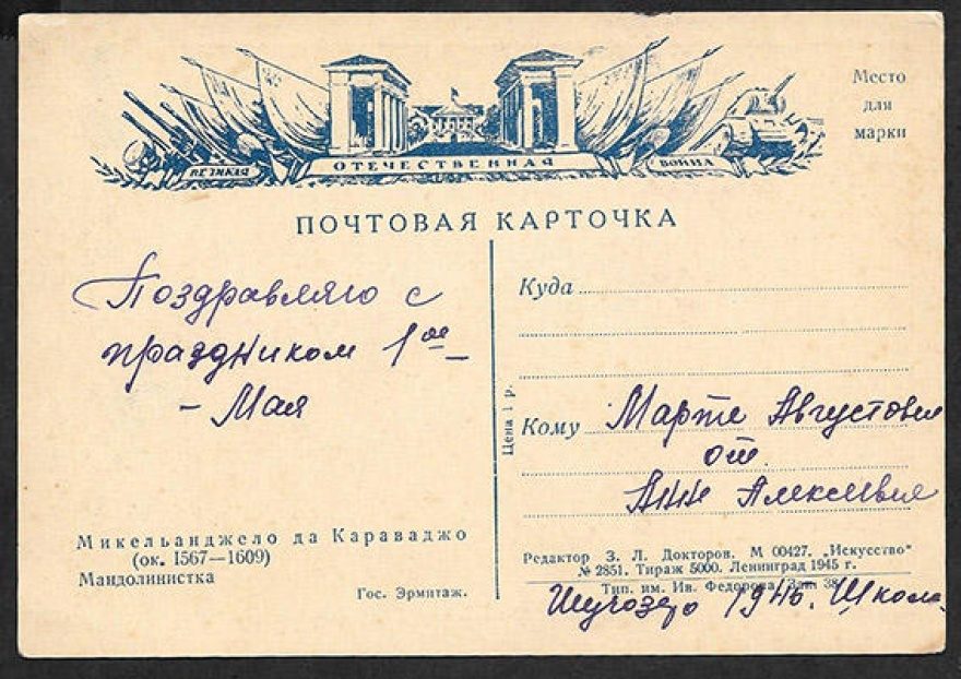 Описание открытки: М 00427. "Искусство" №2851. Тираж 5000. Ленинград 1945 г. Тип. им. Ив. Федорова. Зак. 38