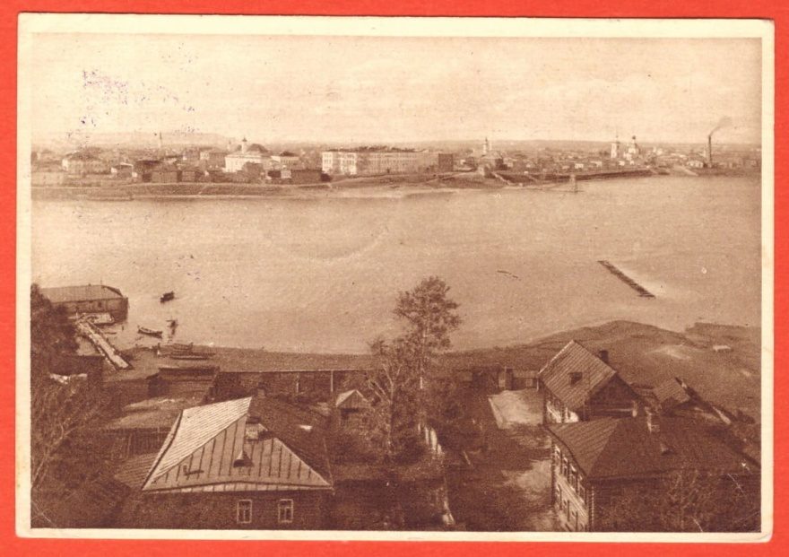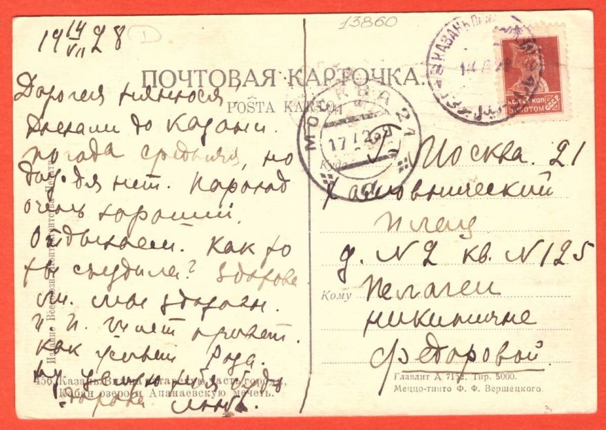 {14 VII 1928} Дорогая нянюся! Доехали до Казани. Погода средняя, но дождя нет. Пароход очень хороший. Отдыхаем. Как то ты [?схудила]? Здорова ли. мы здоровы. И. И. шлет привет. как живет Роза. ну целую тебя будь здорова люба.