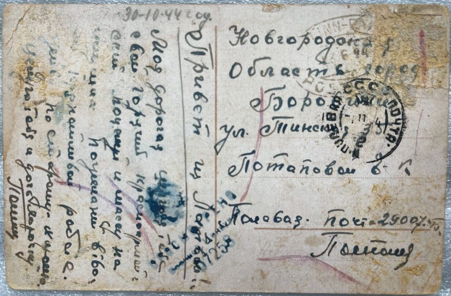 30-10-44 год. Привет из Латвии! Моя дорогая шлю тебе свой горячий [красио..рмей], свой поцелуй и массу наилучших Пожеланий в тво[ей] [нрзб] кропотливой работе. [нрзб] по старому - хорошо. Целую тебя и дочь Ларочку