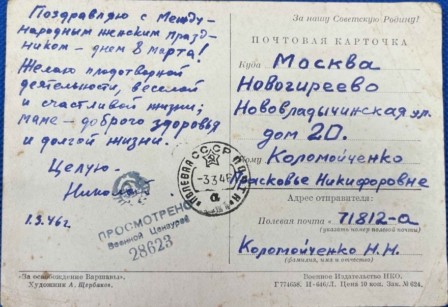 Поздравляю с международным женским праздником — днем 8 марта! Желаю плодотворной деятельности, веселой и счастливой жизни; маме — доброго здоровья и долгой жизни. Целую. Николай 1.3.46г.