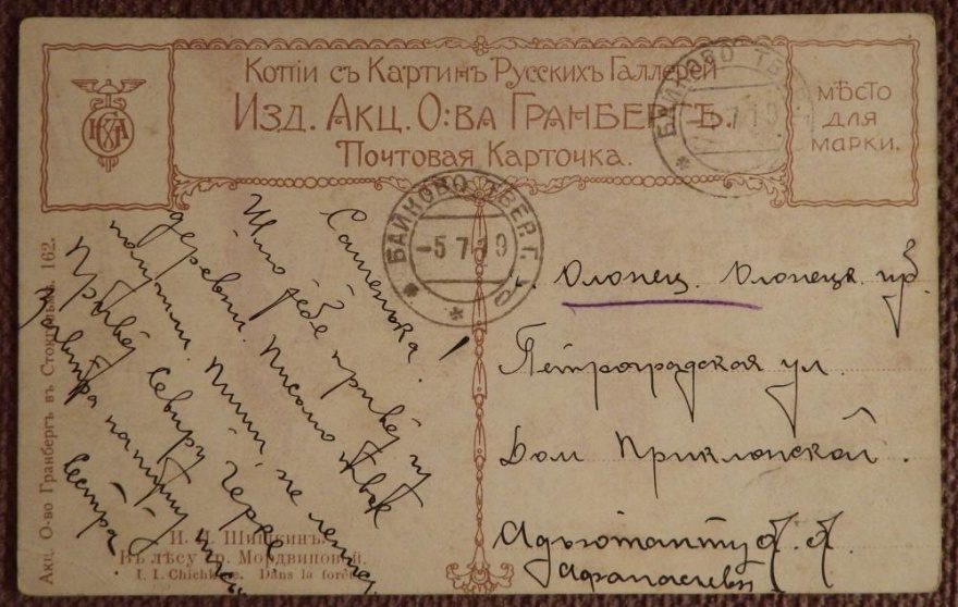 Куда: Олонец, Олонецк[ая] губ[ерния], Петроградская ул[ица] Дом Приклонской