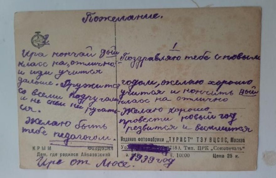 {Пожелание.} Ира кончай 9ый класс на "отлично" и иди учится [^учиться] дальше. Дружится[^дружиться] со всеми подругами и не скем[^ни с кем] не ругаться. Желаю быть тебе педагогом Ире от Люсе[^Люси]. {Поздравляю тебя с новым годом, желаю хорошо учится [^учиться] и кончить 9ый класс на отлично Желаю хорошо провести новый год резвится[^резвиться] и веселится[^веселиться]} {1939 год} {ИРА ЖИВИ ХОРОШО И НЕ СИРЧАЙ[^СЕРЧАЙ] НИ НА КОГО}