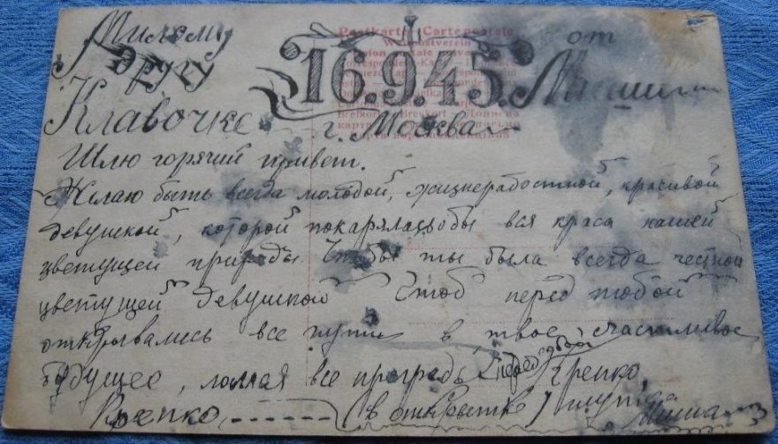 16.9.45 Милому другу Клавочке от Миши Шлю горячий привет. Желаю быть всегда молодой, жизнерадостной, красивой девушкой, которой покарялась [^покорялась] бы вся краса нашей цветущей природы. Чтобы ты была всегда честной цветущей девушкой. Чтобы перед тобой открывались все пути в твое счастливое будущее, ломая все преграды перед тобойкрепко, крепко ------ (в открытке) [...луп..] Миша
