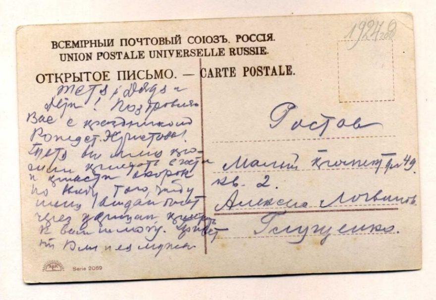 {1924 год} Тетя, дядя и дети! Поздравляю Вас праздником Рождест[вом] Христовы[м]. Тетя вы меня просили приехать в гости и привести [? окорок] но ввиду того, что у меня отдан билет через Царицын Приехать к вам не могу. Привет от Юли и ее мужа.