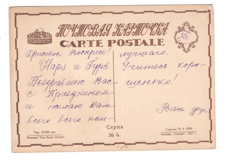 Описание открытки: Кинопечать. Кино - Издательство - РСФСР. Тир. 25.000 экз. Издание Теа - Кино - Печать. Серия № 4. Главлит № А - 2400. Москва, "Гознак". 1927 г.