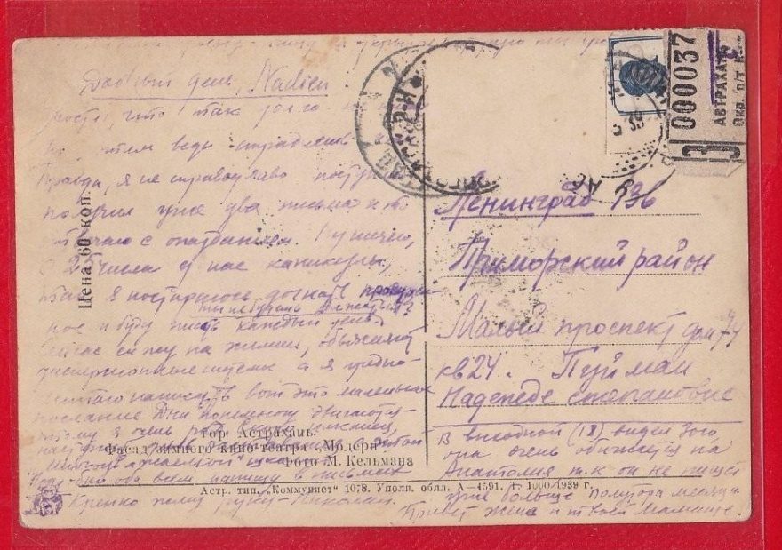 Описание открытки: Астр. тип. "Коммунист" 1078. Уполн. облл. А - 4591. Т. 1000. 1939 г.