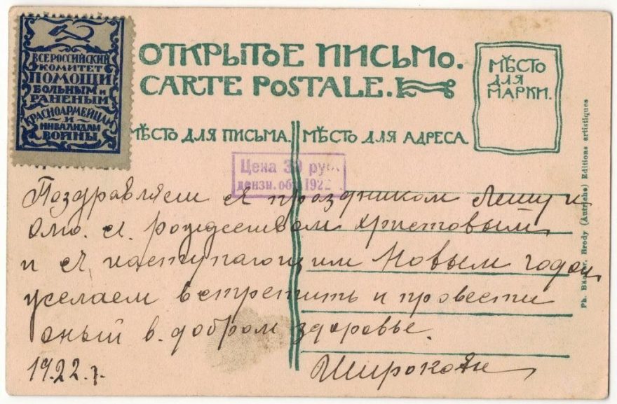 Поздравляем с праздником Лешу и Олю с рождеством христовым и наступающим Новым годом. Желаем встретить и провести его в добром здоровье. Широковы. 1922.