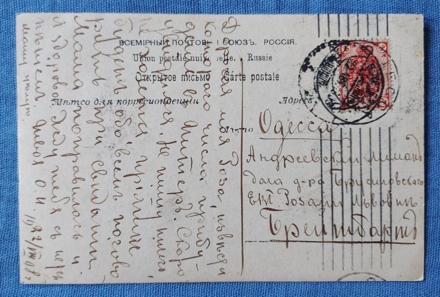 Дорогая моя Роза, извести которого числа прибудете в Питер. Скоро увидимся. Не пишу ничего, не хочется, [?примите] будет обо всем поговорить при свидании мама поправилась и я здоровая. Жду тебя с нетерпением. Твоя О. И. Машу целую 22/VIII 1908 г.