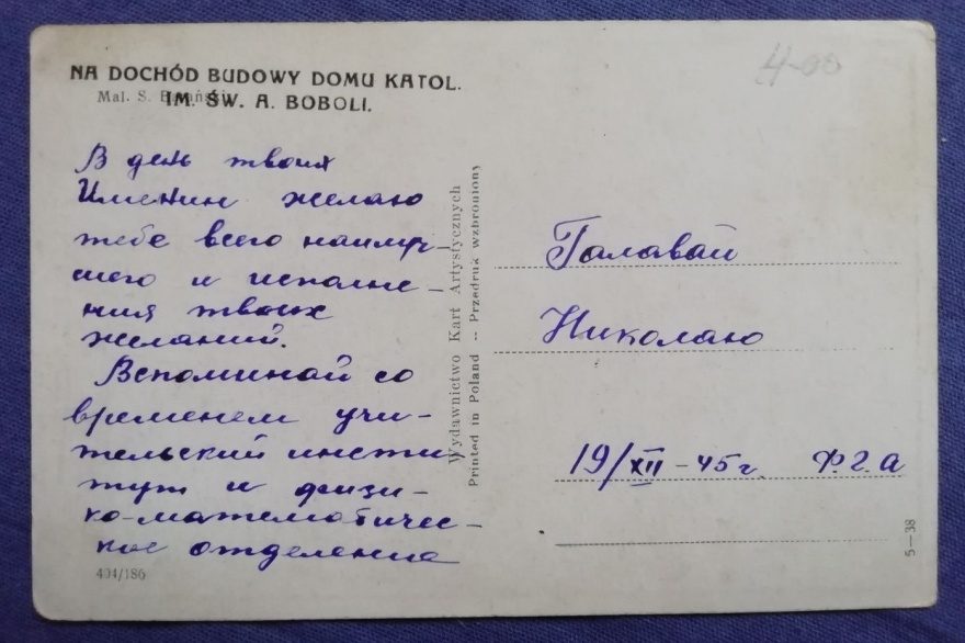 В день твоих Именин желаю тебе всего наилучшего и исполнения твоих желаний. Вспоминай со временем учительский институт и физико-математическое отделение.