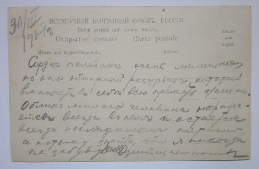 {31/III. 1909 г} Сердце человека очень маленькое, но оно обширный резервуар, который вмещает в себя всю прелесть жизни. Облик милаго [^милого] человека отражается всегда в нем и остается всегда неслгадимым [^несгладимым] пятном, а потому знайте, что я никогда не забуду Вас. Один из немногих
