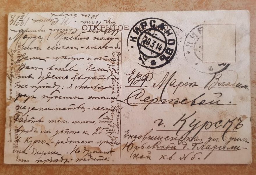 {Привет из Кирсановских «грязей»!} {Сейчас пришел из бани. П. Сергей 10 час вечера 19/III 1914} Маруся! Письмо получил сейчас - спасибо Вам - целую крепко Вас всех. Если ты будешь хворать - не приеду: я сколько раз просил этим не заниматься - неслух! Работы так много, что вряд ли успею к 25-му в Курск - работаю целыми днями. Но думаю что приеду. Ждите. {Работу у одного пастера кончу завтра и начну у другого} {Чувствую себя [нрзб]}