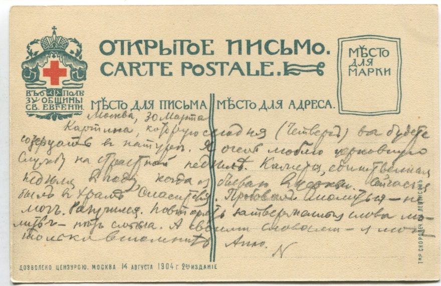 Описание открытки: Т-во скоропеч. А.А. Левенсон. Москва 14 августа 1904 г. 2-ое издание