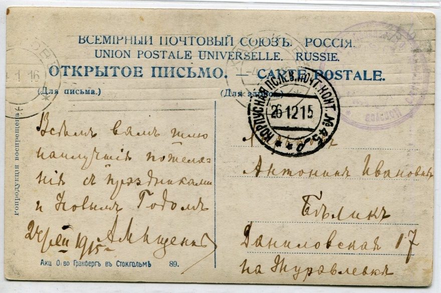 Дата отправления, штамп: 26 декабря 1915