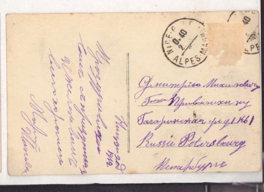 Ницца год 1912 Проздравляю [^Поздравляю] вас с праздником ижелаювам [^ и желаю вам] всего хорошего Мария Иванова