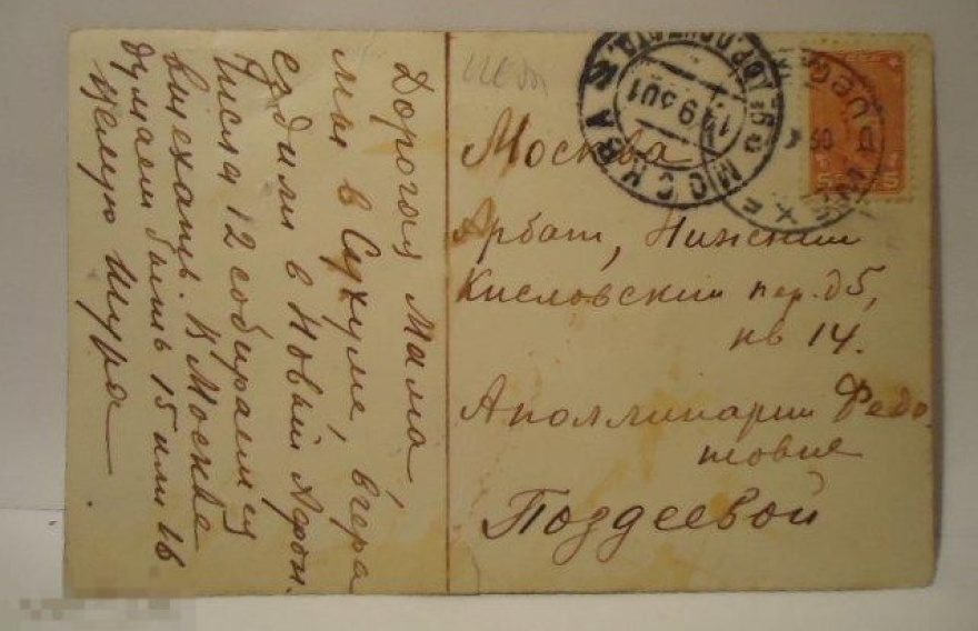 Дорогая Мама, мы в Сухуме [^Сухуми], вчера ездили в Новый Афон. Числа 12 собираемся выехать. В Москве думаем быть 15 или 16 Целую Шура