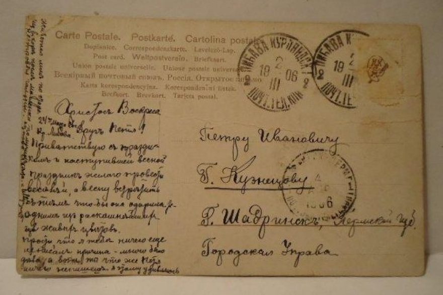 {2 [нрзб]/го Март 06 г. Кр. Либава} Христос Воскресе Друг Петя! Приветствую с праздником и наступившей весной праздник жилаю[^желаю] провести весельи, а весну встретить с тем что-бы [^чтобы] она одарила тебя одним из раскошнейших [^роскошнейших] живых цветов. прости, что я тебе ничего еще не писала причина - много было [?дел], а вот ты что же Петя ничего не пишешь я этому удивляюсь {Живется мне по старому в хоре после [?магически] получше [нестр...] [?жизнью]. [?еще раз] Хв. [нрзб]}