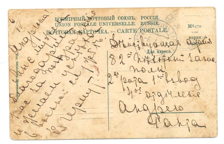 Куда: Действующая армия 82й Пехотный запас[ной] полк 2-ая рота 1-й взвод 4-е отделение