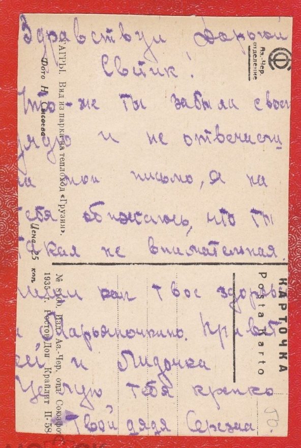 Описание открытки: №8100. Изд. Аз.-Чер. отд. Союзфото 1935 г. Ростов-Дон Крайлит П-58. Цена 25 коп.