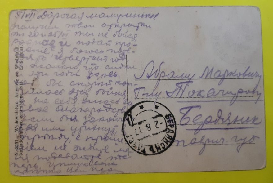 5/VII Дорогая мамуленька получил твои открытки от 20 и 25/VI. Ты не бойся, родная и подай прощание, я боюсь потерять четвертый год. Я жалею, что сидел и эти годы здесь. Хоть бы скорей кончилась эта бойня. Я на себя злюсь за свое благородство. Если бои закончатся или утихнут, я приеду. С прошением не ждите меня, подавайте теперь. Целую вас крепко [Це...].