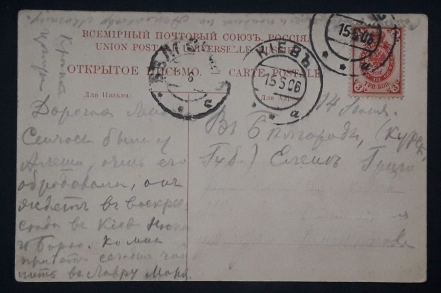 Дорогая Лена, сейчас была у Алеши, очень его обрадовала, он ждет в воскрес[енье] сюда в Киев Ню[?ту] и Борю. Ко мне приедет сегодня чай пить в Лавру Моря. {Сейчас [нрзб] и поедем на Аскольдову Могилу.} {Крепко целую} {14 июня}