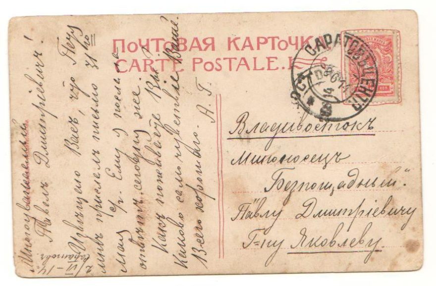 {2/VI-14 г. Саратов} Многоуважаемый Павел Дмитриевич! Извещаю Вас, что Петя мне прислал письмо 31го мая с[его]/г[ода]. Ему я послала ответ. сегодня же. Как поживаете Вы? Каково самочувствие Ваше? Всего хорошего. А.Г.
